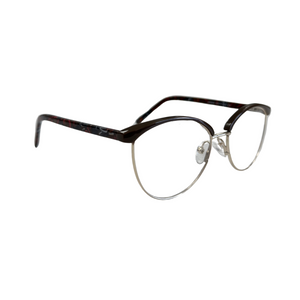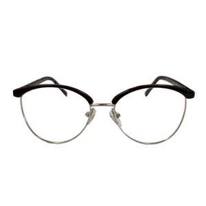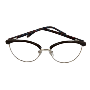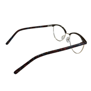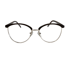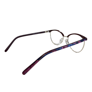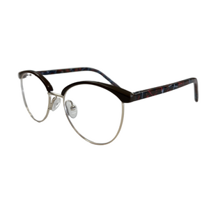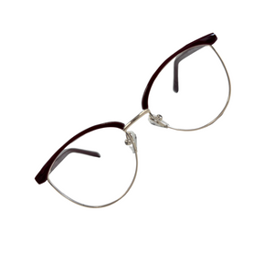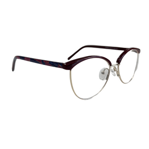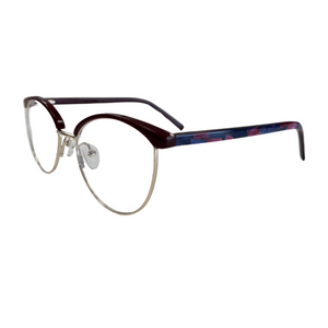 AMELYS marie avec subtilité un haut en plastique teinté et une base en métal doré, pour un contraste raffiné et féminin. Proposée en deux déclinaisons sophistiquées : noir profond avec branches effet marbré rouge-bleu, ou bordeaux intense avec branches nacrées aux nuances violacées. Une monture idéale pour celles qui recherchent de la légèreté sans compromettre le style.