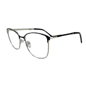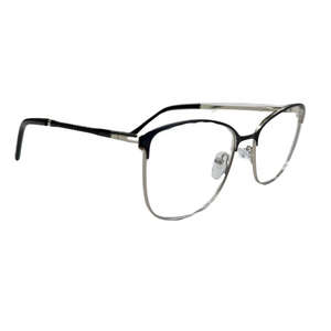 Avec sa forme légèrement papillon et son contraste noir/argent, NAÏRA impose un style chic et structuré. La ligne noire mate sur le dessus encadre le regard avec intensité, tandis que la finesse métallique argentée adoucit l’ensemble. Une monture pensée pour conjuguer élégance, autorité et féminité.